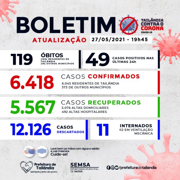 A Prefeitura de Tailândia, nordeste paraense, divulgou na sua página oficial no Facebook na tarde da última quinta-feira (27), o Boletim Epidemiológico da Covid-19.