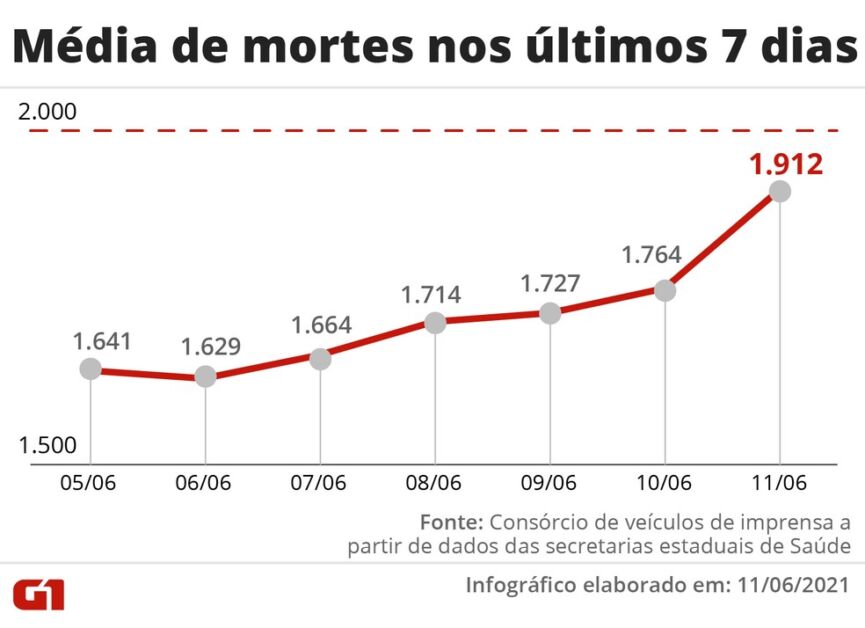 O Brasil registrou 2.215 mortes por Covid-19 nas últimas 24 horas, totalizando na última sexta-feira (11), 484.350 óbitos desde o início da pandemia. Com isso, a média móvel de mortes nos últimos 7 dias chegou a 1.912 voltando a ficar acima de 1,9 mil após 18 dias. Em comparação à média de 14 dias atrás, a variação foi de +4% e indica tendência de estabilidade nos óbitos decorrentes do vírus.