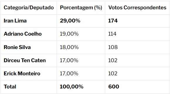 Os dados mostram Iran Lima (MDB) na liderança, com 29% das citações (174 votos), seguido por Adriano Coelho (PDT), que aparece com 19% (114 votos). Na sequência, surgem Ronie Silva (MDB) com 18% (108 votos), e Dirceu Ten Caten (PT) e Erick Monteiro (PSDB), ambos empatados com 17% (102 votos), revelando uma disputa equilibrada entre os principais nomes.