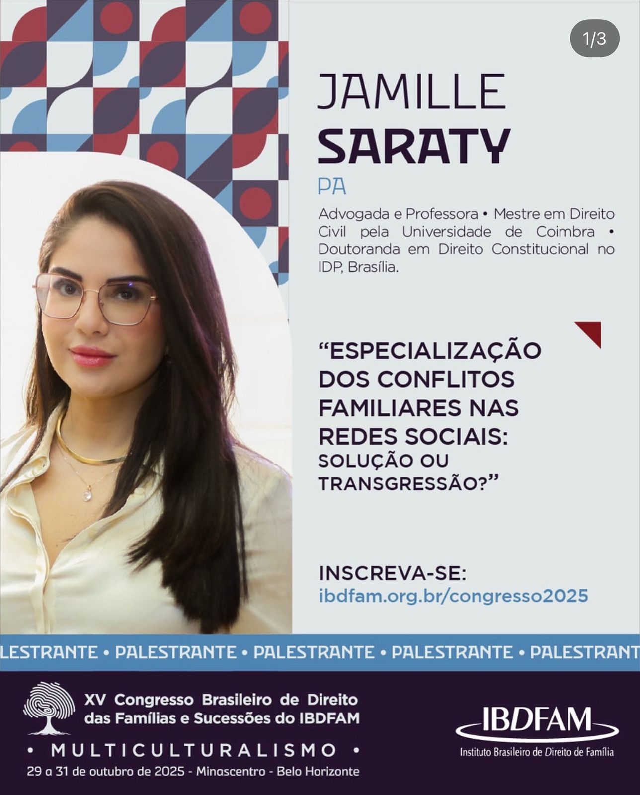 Reconhecida nacionalmente por sua atuação e trajetória, Jamille representa o protagonismo jurídico do Pará em nível nacional. A advogada participa do XV Congresso Brasileiro de Direito das Famílias e Sucessões do IBDFAM, realizado entre os dias 29 e 31 de outubro, em Belo Horizonte (MG), onde será uma das palestrantes convidadas, abordando o tema “Especialização dos Conflitos Familiares nas Redes Sociais: Solução ou Transgressão?”.