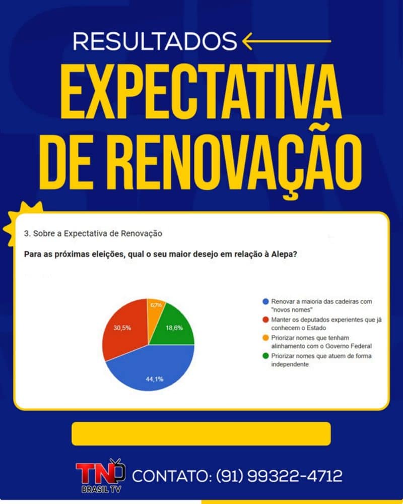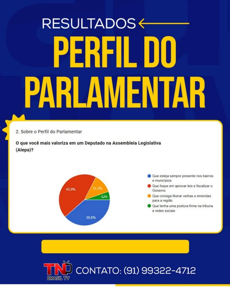 A TN Brasil TV, por meio da coluna Alepa em Foco, lançou uma enquete com o objetivo de ouvir a opinião dos leitores sobre o cenário político da Assembleia Legislativa do Pará (Alepa) e traçar um panorama sobre o perfil ideal do deputado estadual na percepção do eleitor paraense. Ao todo, 600 pessoas participaram da consulta.