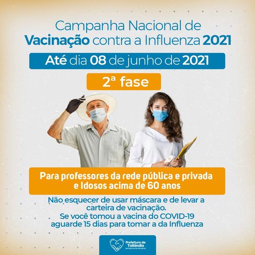 A Prefeitura de Tailândia, divulgou na sua rede social no Facebook na última segunda-feira (17), sobre a Campanha Nacional de Vacinação contra a Influenza 2ª Fase. Para professores da Rede pública e Privada e Idosos acima de 60 anos.