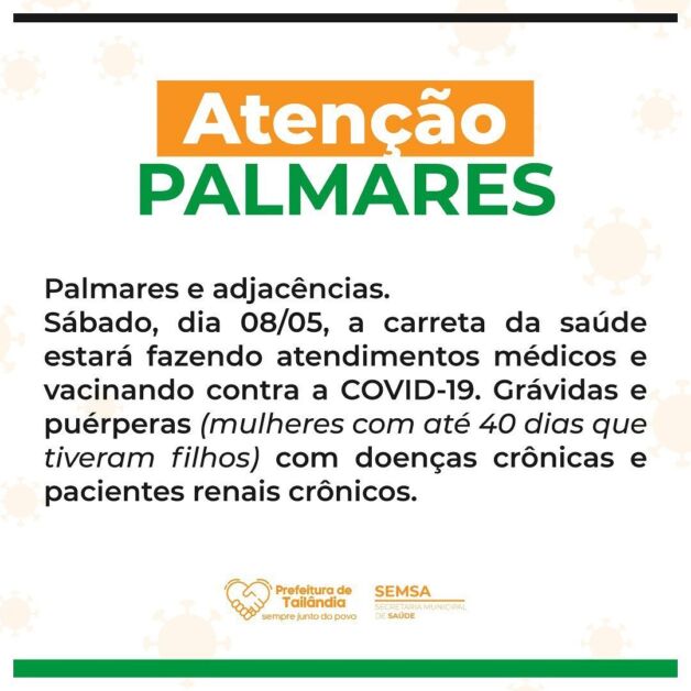 Neste sábado (08), a Carreta da Saúde estará realizando atendimento e vacinação contra a Covid-19, no Distrito Palmares e adjacências, município de Tailândia.