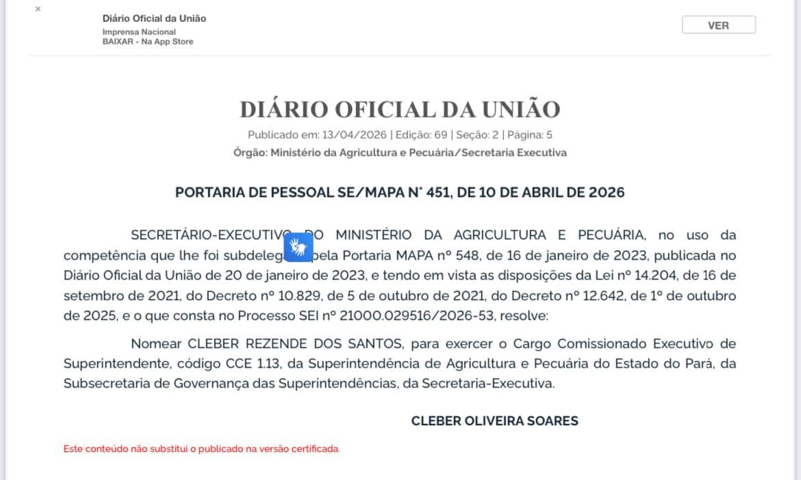 A nomeação de Cleber Rezende dos Santos como novo superintendente da Superintendência de Agricultura e Pecuária do Pará foi oficializada por meio de portaria publicada no Diário Oficial da União no dia 13 de abril de 2026. A função está vinculada ao Ministério da Agricultura e Pecuária do governo do presidente Luiz Inácio Lula da Silva.
