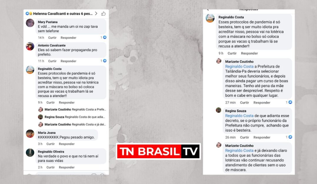 Um dos comentários do perfil de “Reginaldo Costa” ele chama as colaboradoras das lótericas de “vacas” por estarem seguindo os protocoloes de segurança ao atenderem usuários somente com máscara em cumprimento às medidas de segurança contra a Covid-19 no estado do Pará e no município.