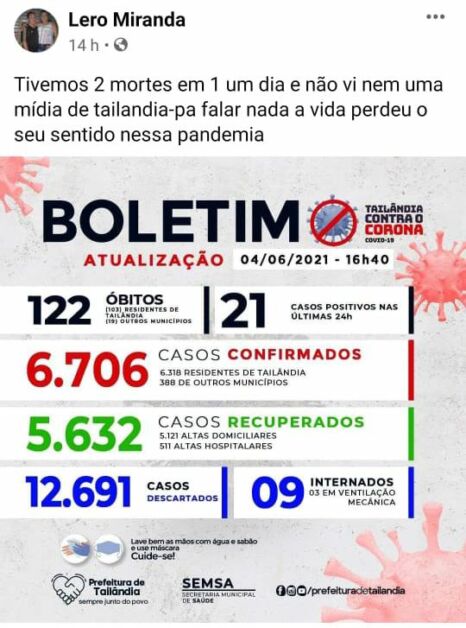 Em Tailândia, nordeste do Pará, uma polêmica surgiu quando um popular, conhecido como Lero Miranda, publicou que no município dois óbitos ocorrem por Covid-19 e a mídia teria se omitido “Tivemos 2 mortes em 1 um dia e não vi nem uma mídia de tailandia-pa falar nada a vida perdeu o seu sentido nessa pandemia“, o comentário gerou reações dos internautas, como você pode ver nos prints enviandos a nossa redação: