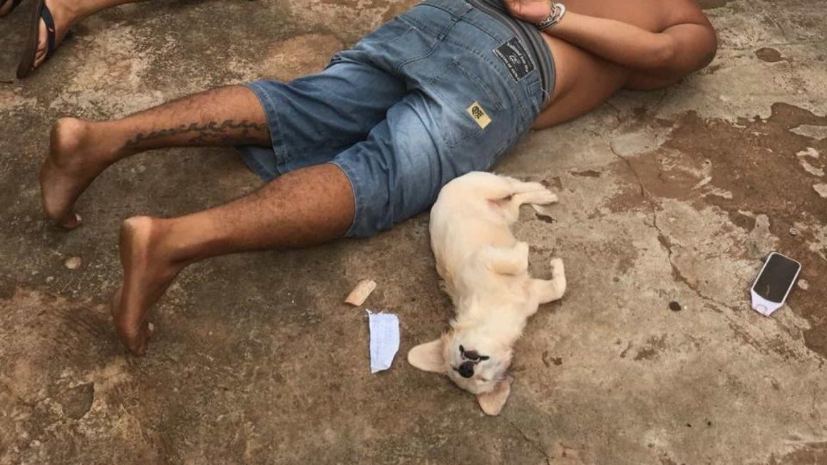 Tudo aconteceu quando dois suspeitos de tráfico de droga foram detidos em Deodápolis, em Mato Grosso do Sul. Os dois homens foram algemados e colocados de barriga para baixo, altura em que surgiu a cadela de um deles e decidiu roubar todas as atenções.