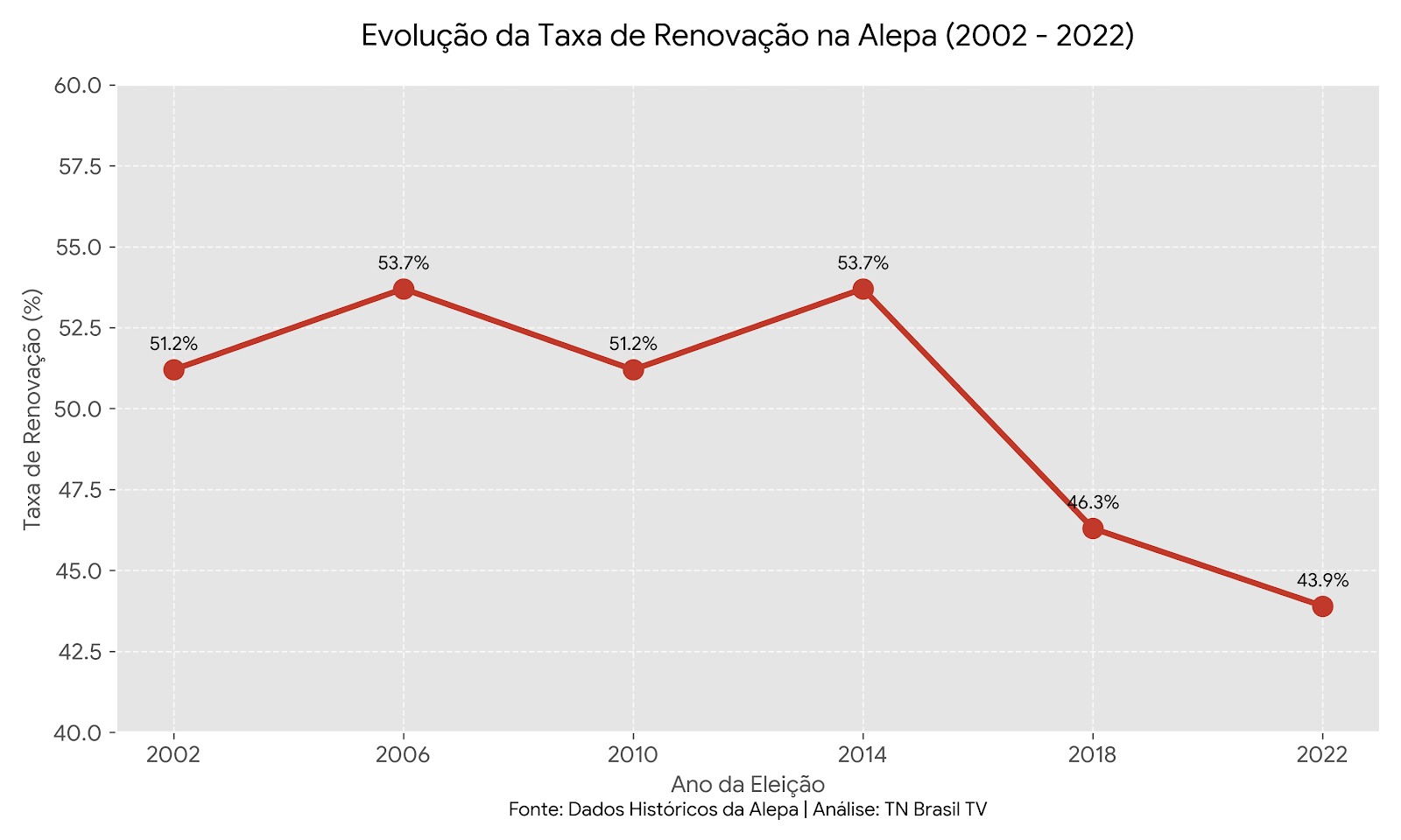 O parlamento paraense, a Assembleia Legislativa do Pará (Alepa), é formada por 41 deputados, eleitos a cada 4 anos. Em 2002, o índice de renovação chegou a 51,2%. Na eleição de 2006, subiu para 53,7%. Em 2010, foi de 51,2% e em 2014 pulou para 53,7%. Porém, isso vem mudando consideravelmente ao longo dos dois últimos pleitos, 2018 e 2022. Na disputa de 2018, a taxa de renovação foi de 46,3%; no pleito de 2022, caiu para 43,9%.