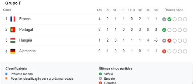 Com o empate a França que havia vencido a Alemanha na estreia por 1×0, continua na liderança somando 4 pontos, Portugal em segundo com 3 pontos, Hungria 1 e Alemanha na lanterna com 0 pontos.