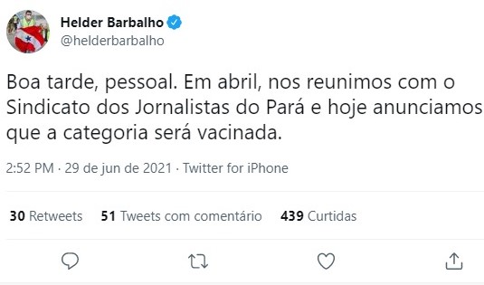 Na tarde desta terça-feira (29), o governador Helder Barbalho, do MDB (Movimento Democrático Brasileiro), anunciou por meio das suas redes sociais, que a categoria dos jornalistas será vacinada contra a covid-19 no Estado.