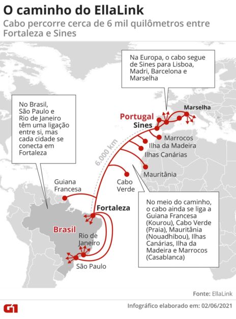 Com cerca de 6 mil quilômetros, o EllaLink sai de Fortaleza, para onde também são enviadas informações de São Paulo e Rio de Janeiro. Há ainda uma ligação com a Guiana Francesa.
