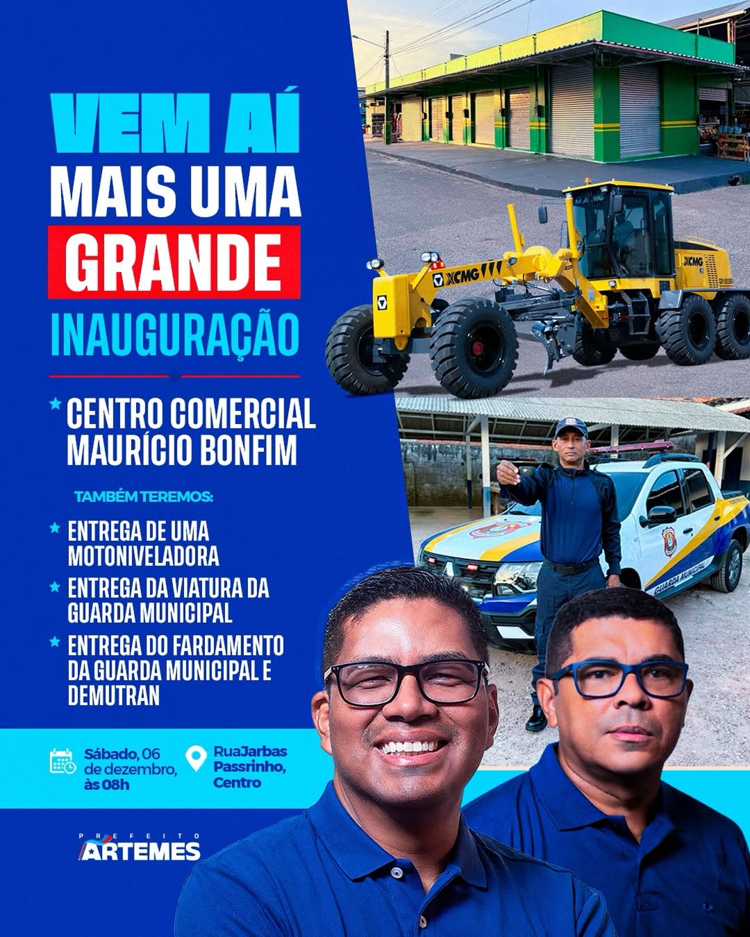Além da entrega do centro comercial, a gestão do prefeito Artemes Oliveira (MDB) também fará a entrega de uma motoniveladora, de uma nova viatura da Guarda Municipal e do fardamento da Guarda Municipal e do Demutran, reforçando a estrutura operacional e os serviços oferecidos à população.