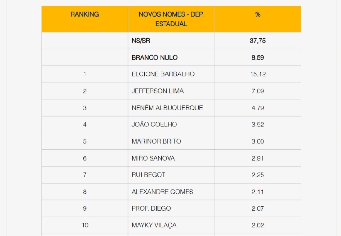 O questionário apresentou 18 novos nomes, todos sem mandato na Alepa (Assembleia Legislativa do Pará). A deputada federal Elcione Barbalho (MDB) ficou em primeiro lugar. Jeferson Lima em segundo lugar com 7,09%, o vereador de Belém, Neném Albuquerque (MDB), é o terceiro colocado com 4,79%.