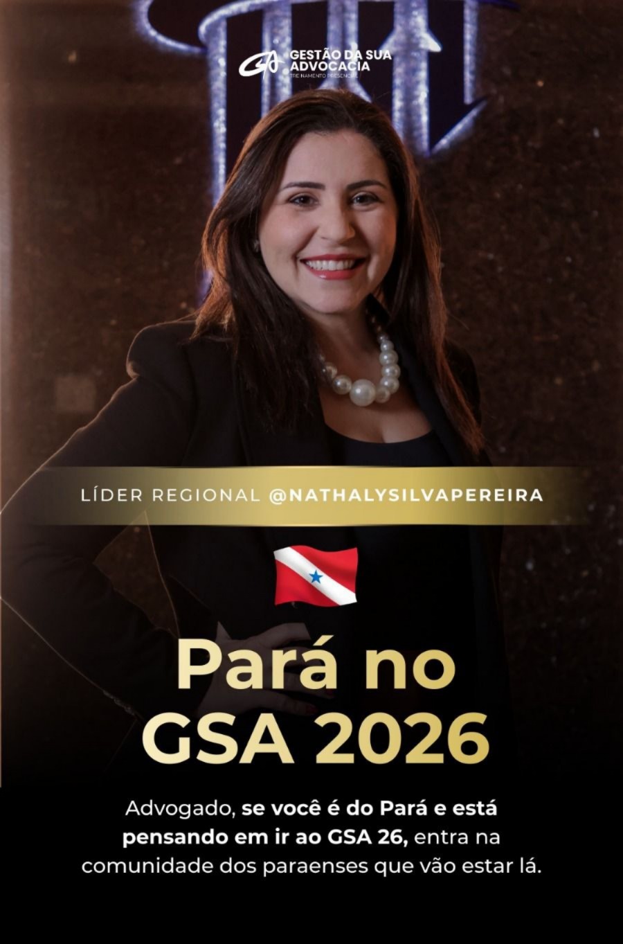 A Líder Regional do Pará no GSA (Gestão da Sua Advocacia), Nathaly Silva Pereira, estará no GSA 2026 e está mobilizando advogados paraenses a participarem do que é considerado o maior treinamento presencial em gestão, marketing e vendas para advogados do país. O evento acontece nos dias 25 e 26 de abril, em São Paulo.