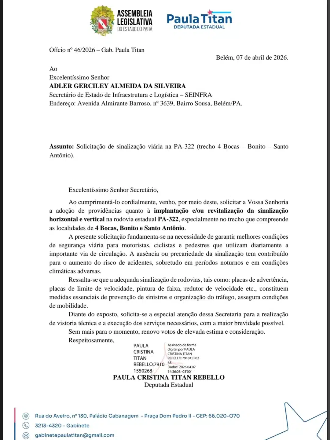 Quando o assunto é qualidade de vida para a população paraense, o mandato da deputada estadual Paula Titan (PP) tem mostrado articulação e presença. A parlamentar solicitou, por meio de ofício, a implantação e revitalização da sinalização na PA-322, nos trechos entre 4 Bocas, Bonito e Santo Antônio do Cumarú.