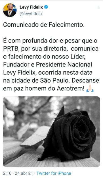 Levy Fidelix, presidente do PRTB (Partido Renovador Trabalhista Brasileiro) morre aos 69 anos, na madrugada da última sexta-feira (23), segundo Sandra Terena que o classificou como um dos pioneiros do conservadorismo brasileiro Fidelix teria falecido por complicações do Covid-19. Porém não foi confirmada a causa morte oficialmente.
