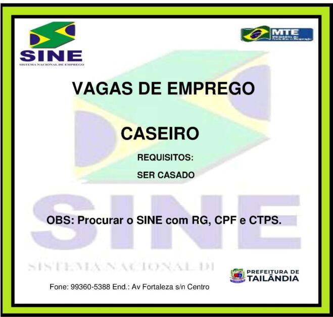 O Sistema Nacional de Emprego (Sine) em Tailândia, divulgou nesta manhã de segunda-feira (24), nova vaga de emprego. A vaga e para Caseiro.