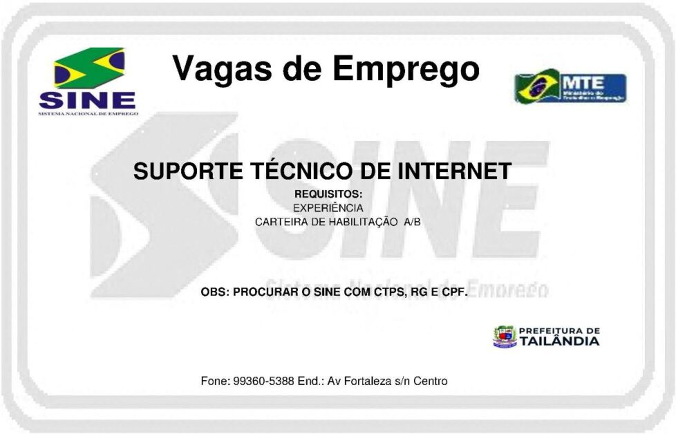 O Sistema Nacional de Emprego (Sine) em Tailândia, divulgou na ultima quinta-feira (20), nova vaga de emprego. A vaga e para Suporte Técnico de Internet.