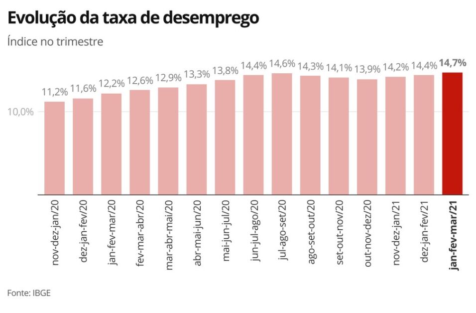 O desemprego no Brasil atingiu a taxa recorde de 14,7% no 1º trimestre de 2021, em meio aos desafios impostos pela piora da pandemia no país, segundo o Instituto Brasileiro de Geografia e Estatística (IBGE). O número de desempregados também bateu um novo recorde, chegando a 14,8, milhões de pessoas.
