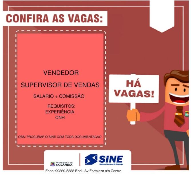O Sistema Nacional de Emprego (Sine) em Tailândia, divulgou na manhã desta segunda-feira (28), novas vagas de empregos. As vagas são para Vendedor e Supervisor de Vendas.