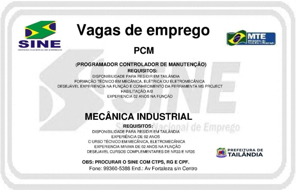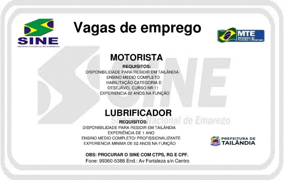 O Sistema Nacional de Emprego (Sine) em Tailândia, divulgou na ultima terça-feira (18), novas vagas de empregos. As vagas são para Motorista, Lubrificador, PCM e Mecânico Industrial.