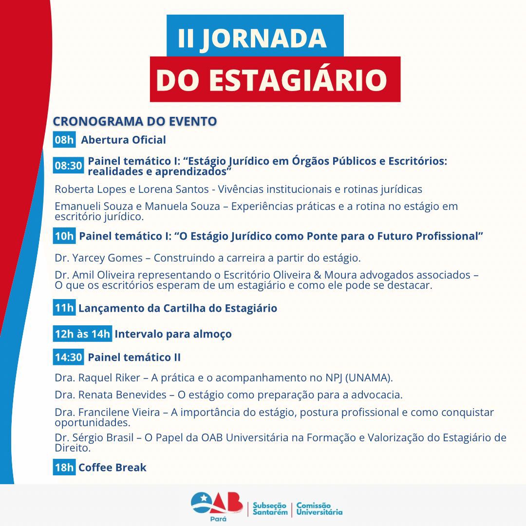 A Comissão OAB Universitária da OAB Subseção de Santarém realizará, no dia 07 de novembro de 2025, a II Jornada do Estagiário, evento voltado à formação prática e à valorização da trajetória acadêmica e profissional dos estudantes de Direito. A atividade acontecerá no auditório do IESPES, nos horários de 8h às 12h e 14h às 18h, reunindo acadêmicos, professores e advogados em um espaço de diálogo, aprendizado e integração.