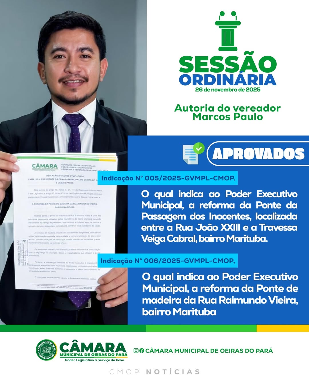 As propostas solicitam ao Poder Executivo Municipal a reforma de duas pontes no bairro Marituba: a Ponte da Passagem dos Inocentes, localizada entre a Rua João XXIII e a Travessa Veiga Cabral, e a ponte de madeira da Rua Raimundo Vieira.