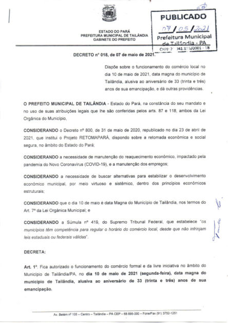 A Prefeitura Municipal de Tailândia, nordeste paraense, divulgou por meio de sua rede social, Facebook, na última sexta-feira (07), o novo decreto nº 018, de 07 de maio de 2021.