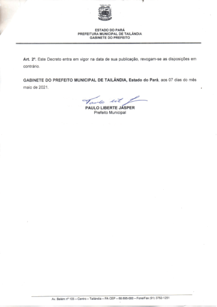 “O novo decreto municipal, entrará em vigor na data da sua publicação. Fica autorizado o funcionamento do comércio formal e da livre iniciativa no âmbito do Município de Tailândia/PA, no dia 10 de maio de 2021 (segunda-feira), data magna do município de Tailândia, alusiva ao aniversário de 33 (trinta e três) anos de sua emancipação”.