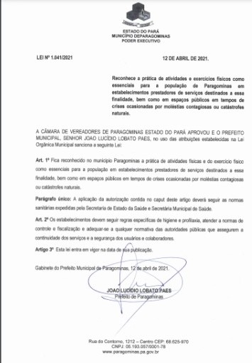 O Projeto de Lei Nº015/2021, de 10 de março, autoria da vereadora presidente da Câmara Municipal de Paragominas, Tatiane Helena, do PTB (Partido Trabalhista Brasileiro), e do vereador Neldson Missão, do PSD (Partido Social Democrático), que torna atividades físicas e exercícios físicos como essenciais foi sancionado pelo prefeito Lucídio Paz, e agora é lei de Nº 9.041.