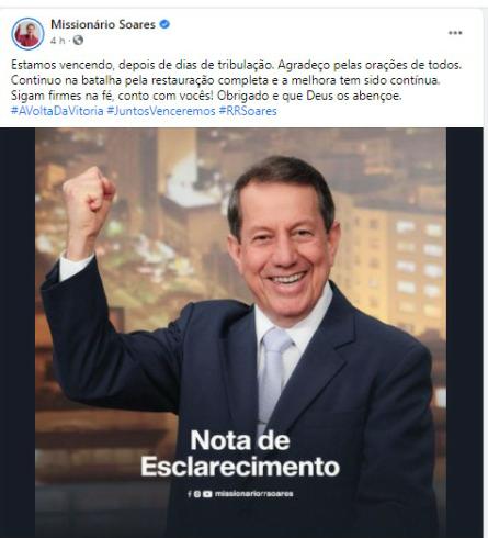 Em nota divulgada na mídia social do pastor é demonstrado fé na recuperação de R.R. Soares: