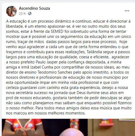 A vice-prefeita, Regina Góes, do munícipio de Tailândia, no nordeste do Pará, é a nova secretaria de Educação, após Ascendino Souza, mais conhecido como professor Neto, pedir exoneração do cargo.