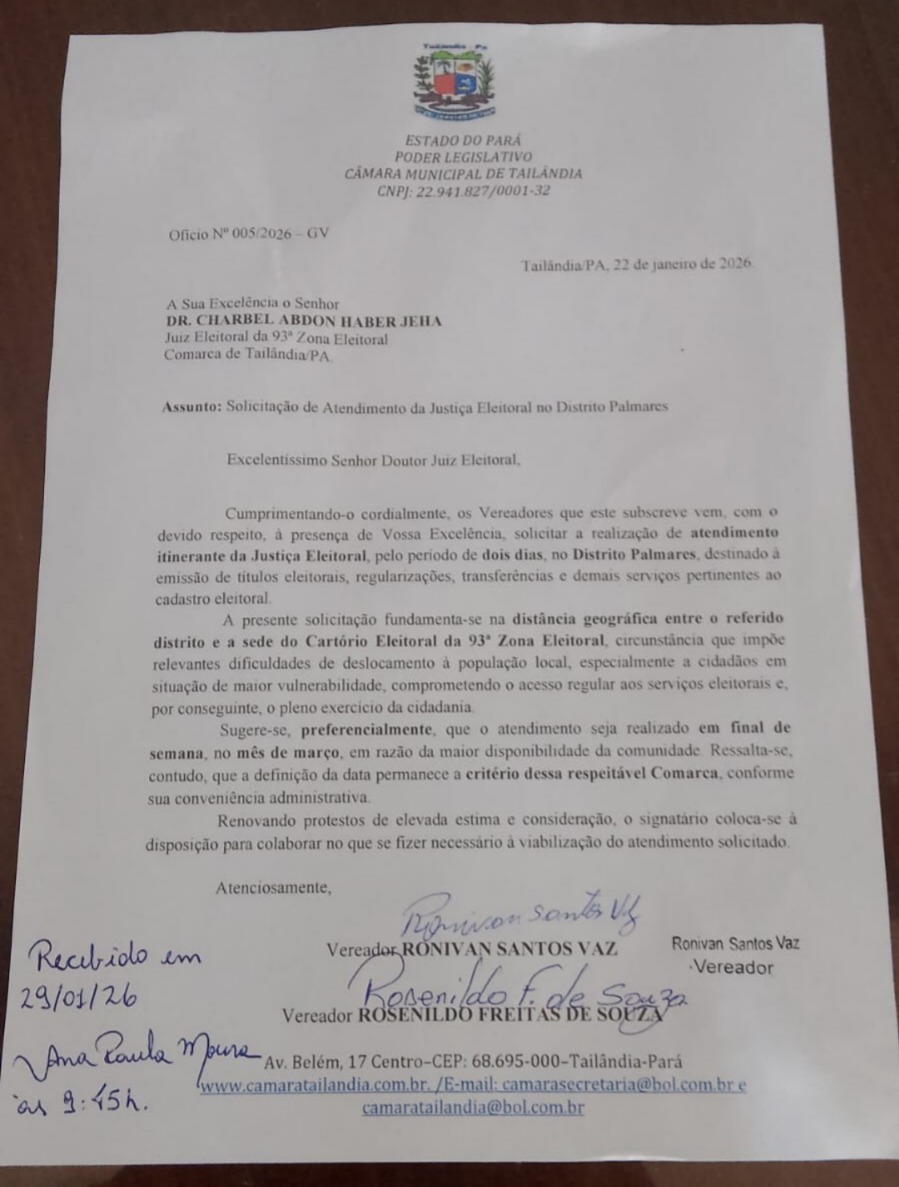 Nesta quinta-feira (29), o vereador Roni Baiano (PSDB) protocolou, junto à Justiça Eleitoral, uma solicitação para a realização de atendimento itinerante no Distrito Palmares, em Tailândia, no nordeste do Pará, buscando garantir à população local o acesso a serviços como emissão de títulos eleitorais, regularizações, transferências e demais procedimentos do cadastro eleitoral, evitando o deslocamento até a sede do cartório.