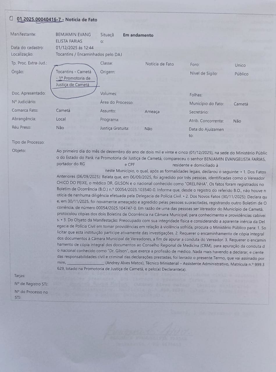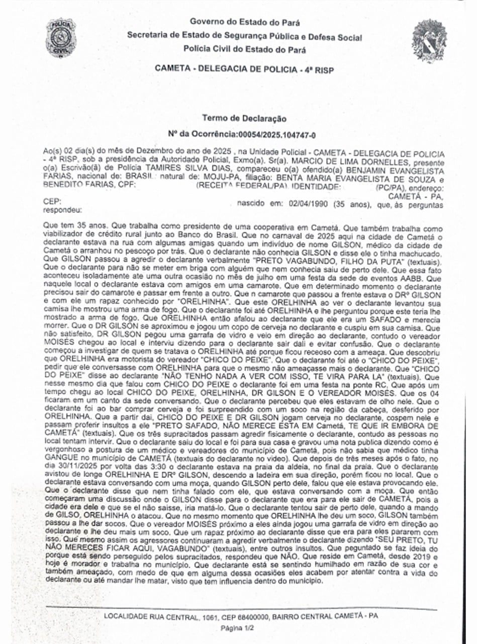 A Denúncia – Benjamin Farias relata ter sido agredido em 6 de setembro de 2025, quando registrou o caso na Delegacia de Polícia Civil de Cametá, mas afirma que, após o boletim de ocorrência, nenhuma providência foi tomada.